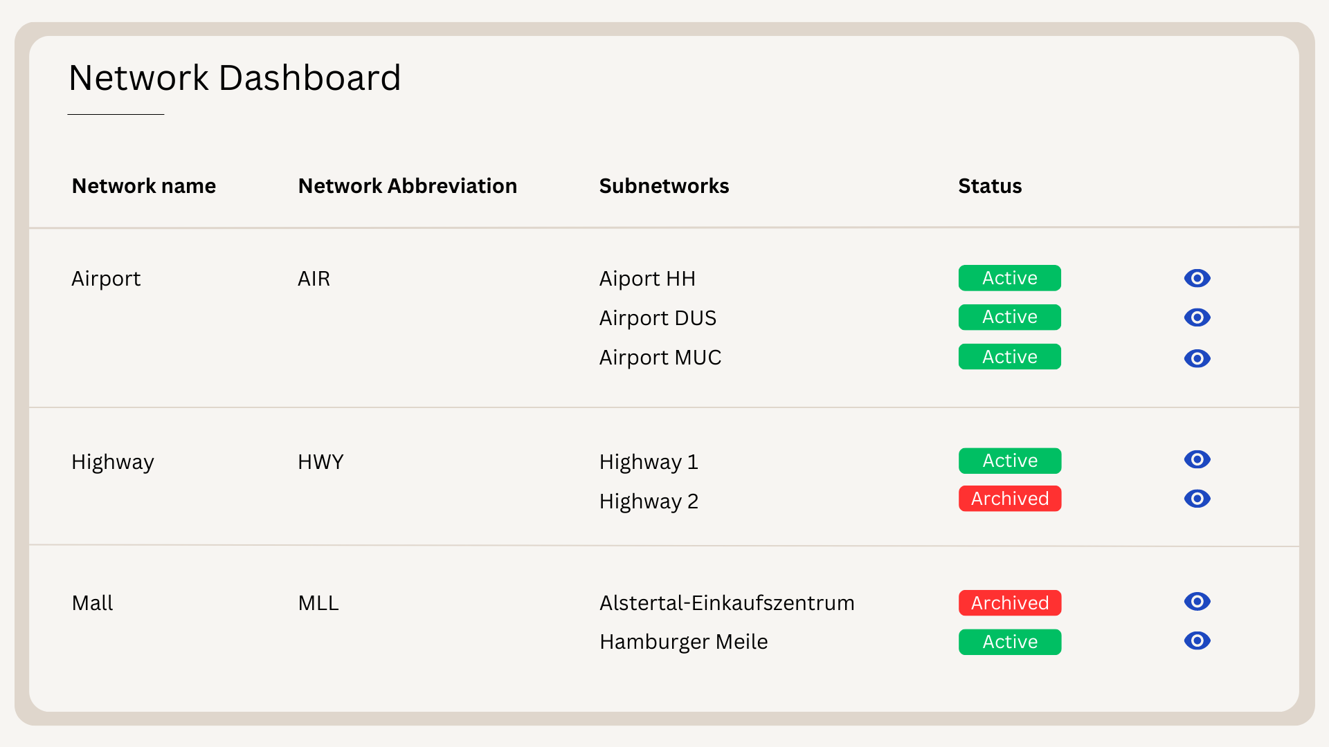 The Network Dashboard provides you with an overview of all networks, including their respective statuses. Have a one-stop glance and check whether a particular network and its subnetworks are active, in maintenance, set-up or disabled. If desired, the individual networks can be scrutinized and edited here.