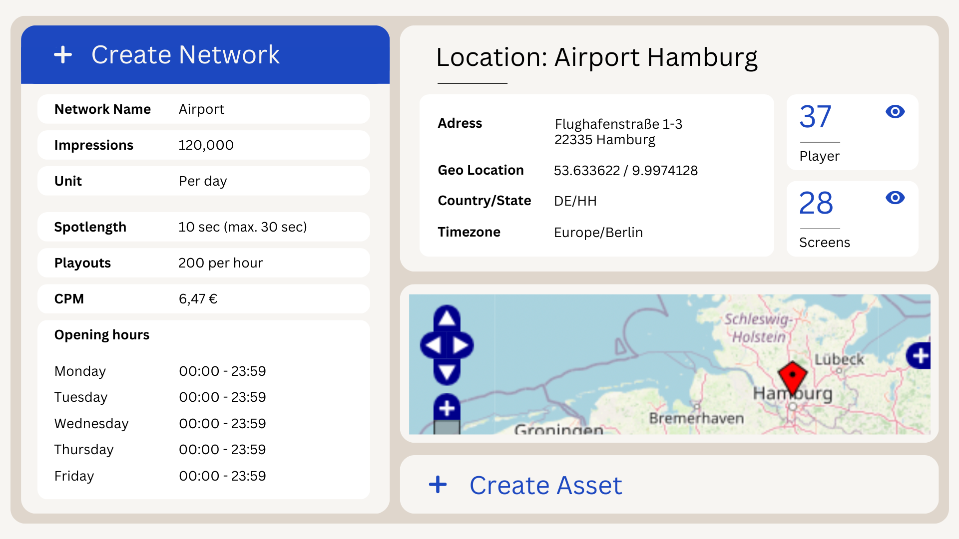 For maximum flexibility, NMS1 allows you to create entire networks and define impressions, spot lengths, playouts per hour, opening hours, and base CPMs. Keep full control of your network in one place and establish a solid basis to boost your sales.